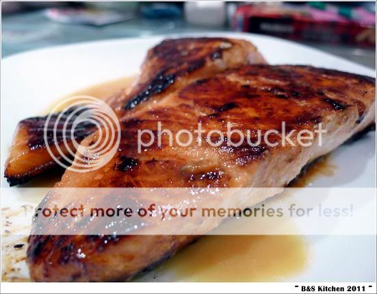 燒熱有條紋的煎鑊。下少許油,先下有魚肉那面,煎至見有條紋出現,約3分鐘。然後翻轉,略煎片刻。轉至一焗盤,放入焗爐中焗約8分鐘。打開焗爐,小心地把醃料淋在三文魚上面,繼續焗多5分鐘。 |