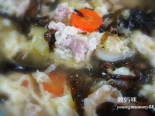 除了还有一道清炒的蔬菜外,还煮了一锅简单的菜汤,包菜,肉碎,红萝卜片,紫菜,鸡蛋。