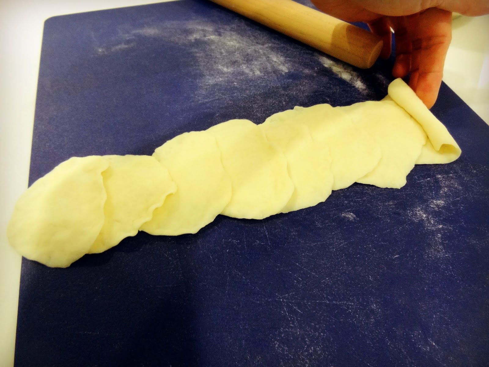 - 把圆形的面团排成一排,每一片在中间的位子重叠。