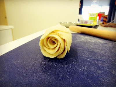 - 我参考的食谱是用筷子把玫瑰锯成两份,我试过了怎么都锯不开,我怕玫瑰会变形所以改用刀子切。用刀子的话就必须在玫瑰花底部稍微捏小。