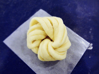 - 像拧毛巾的动作一样,把面团拧成条状,然后转成圆形。把两边的尾端收在下方,漂亮的花卷就完成啦!