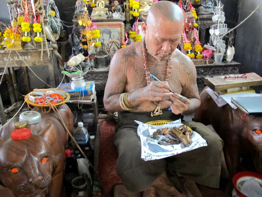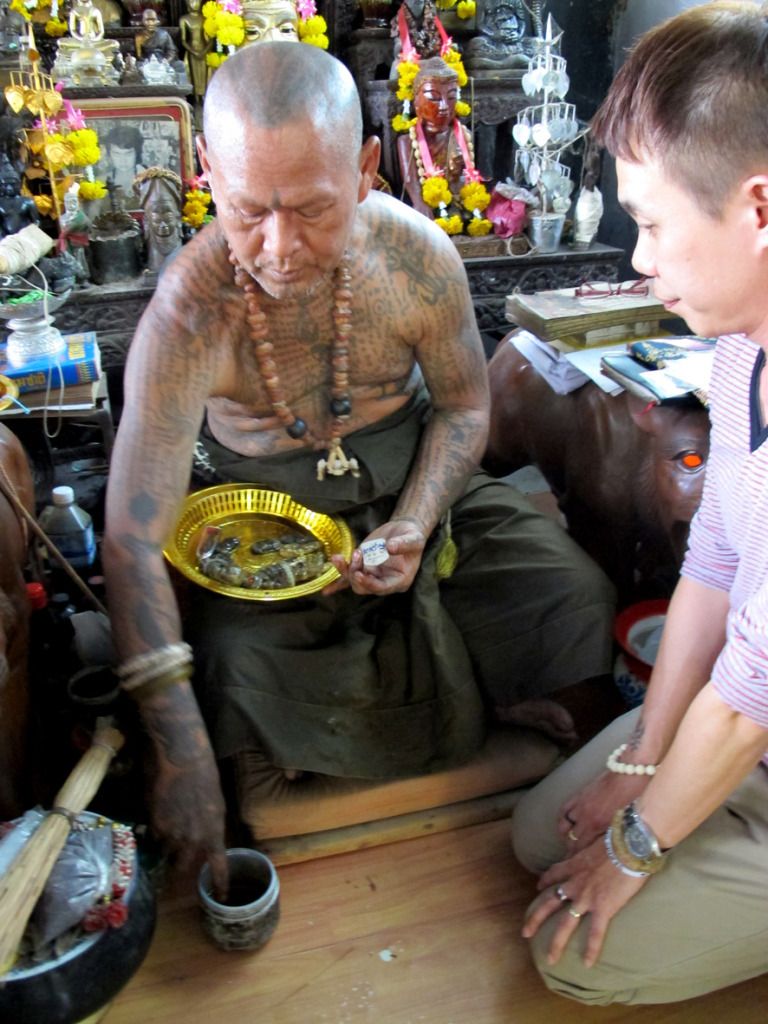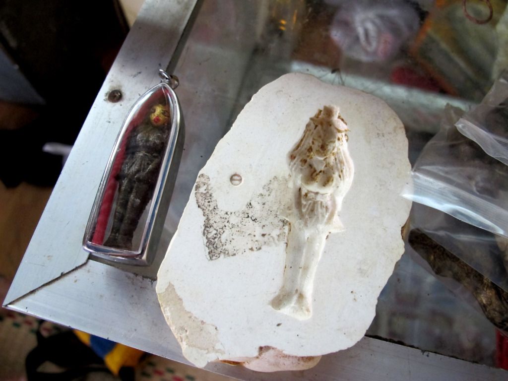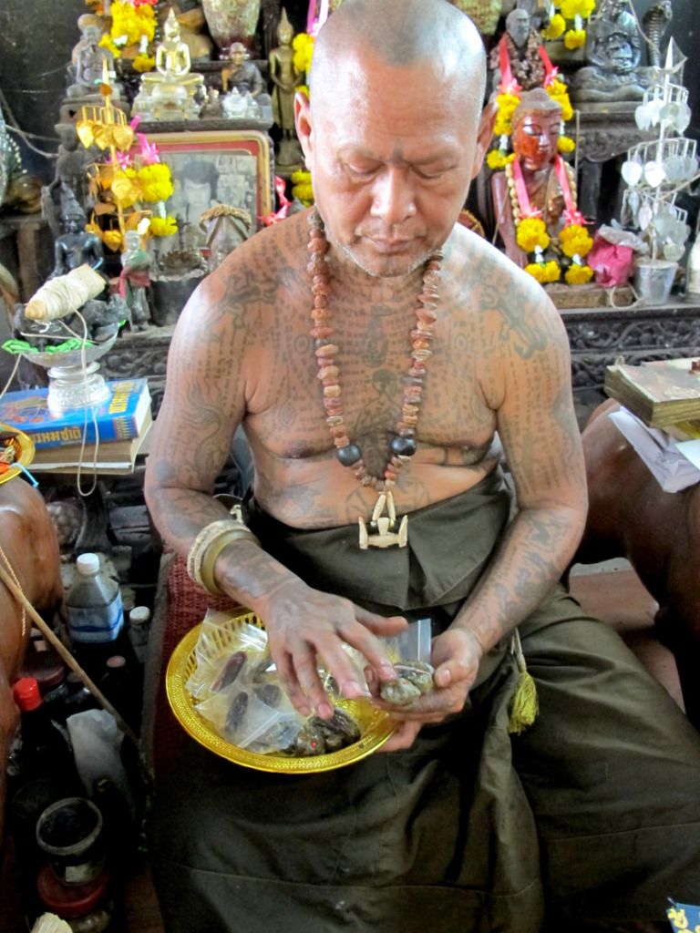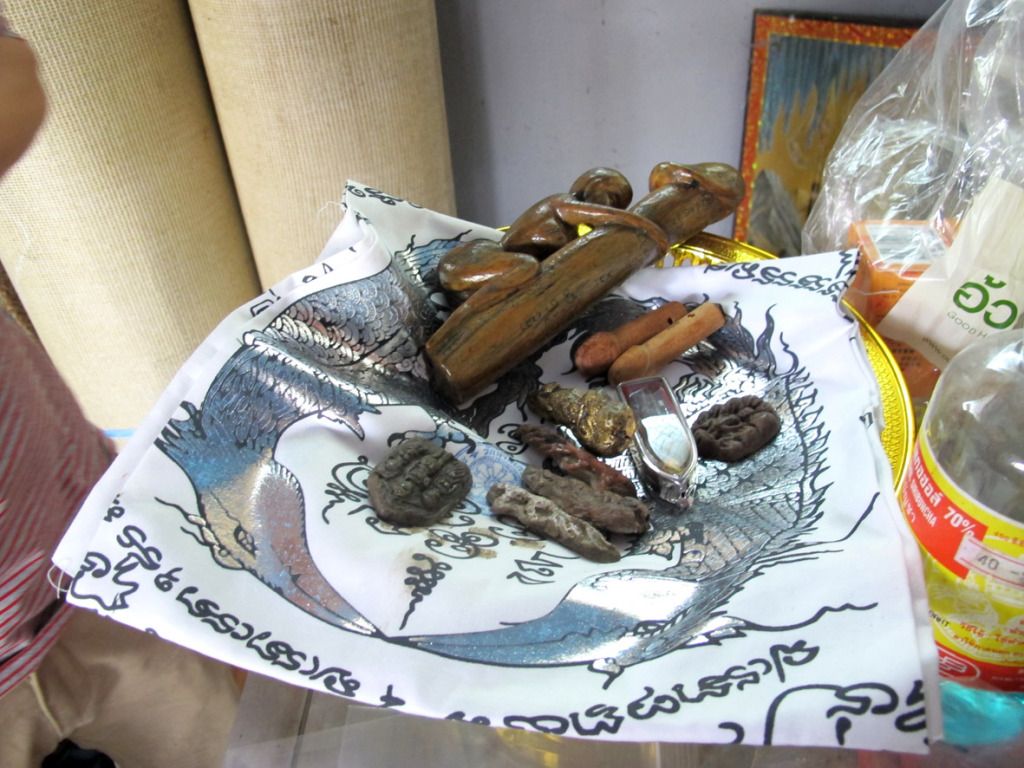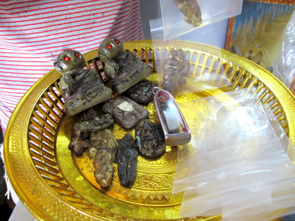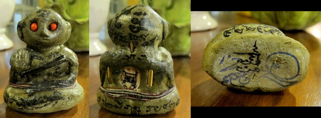 师父刚开光好的古曼~~这是特别版~~后面有一块童子骨^^,三支金tarkut ^^还有一些不知名的材料