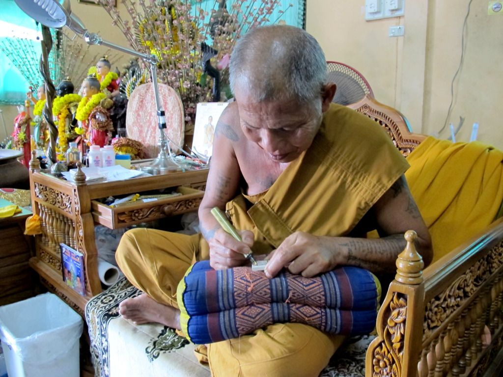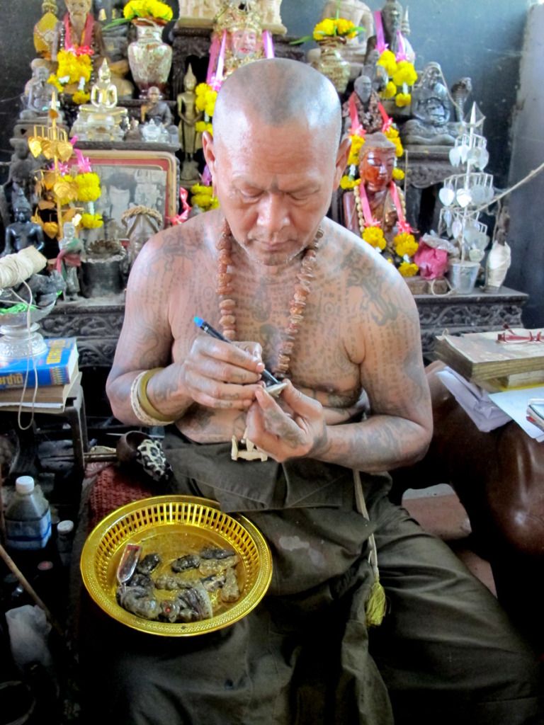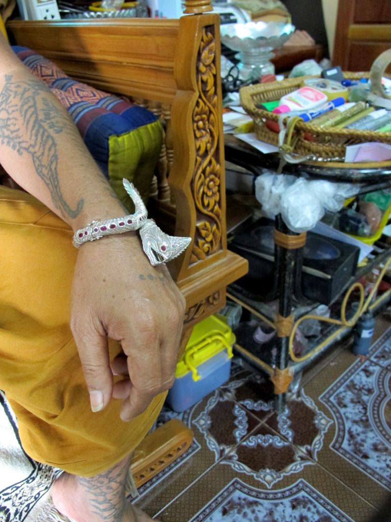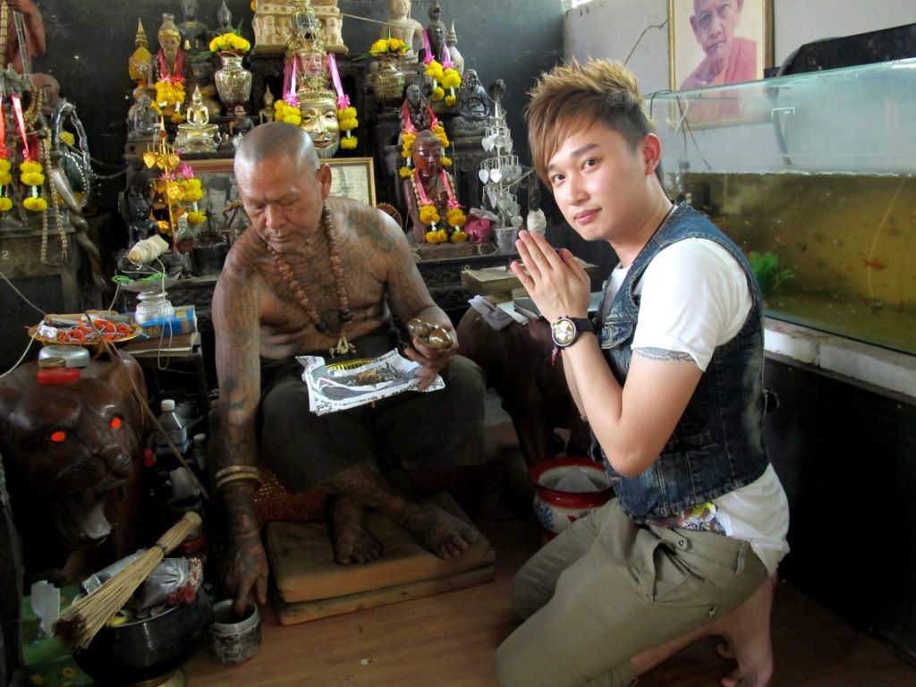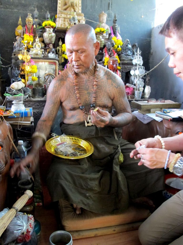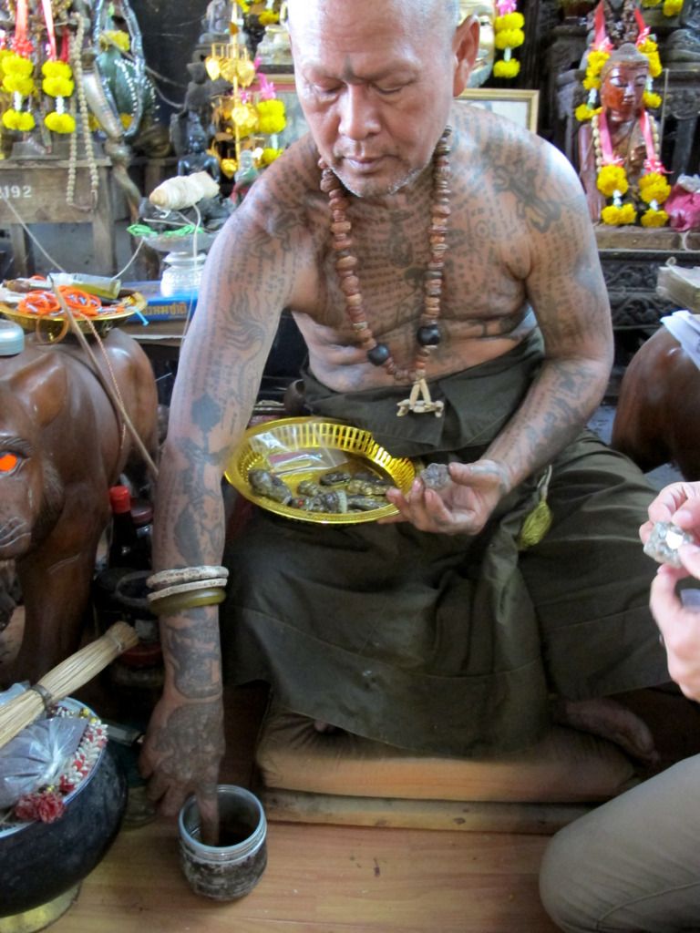 师父刚开光好的古曼~~这是特别版~~后面有一块童子骨^^,三支金tarkut ^^还有一些不知名的材料