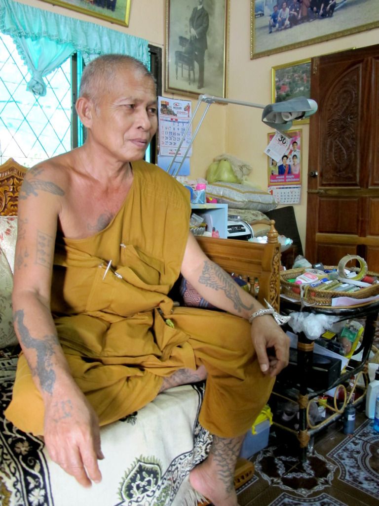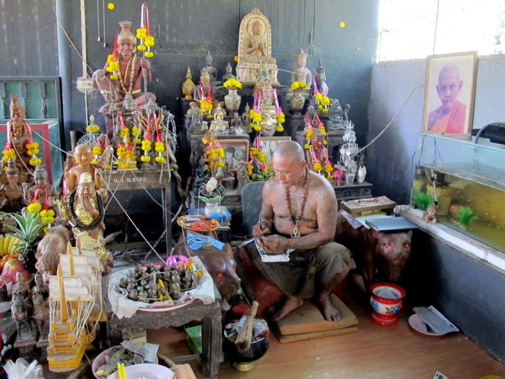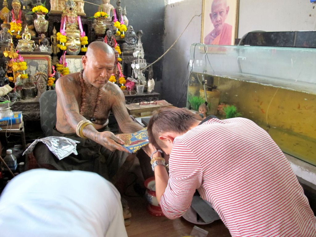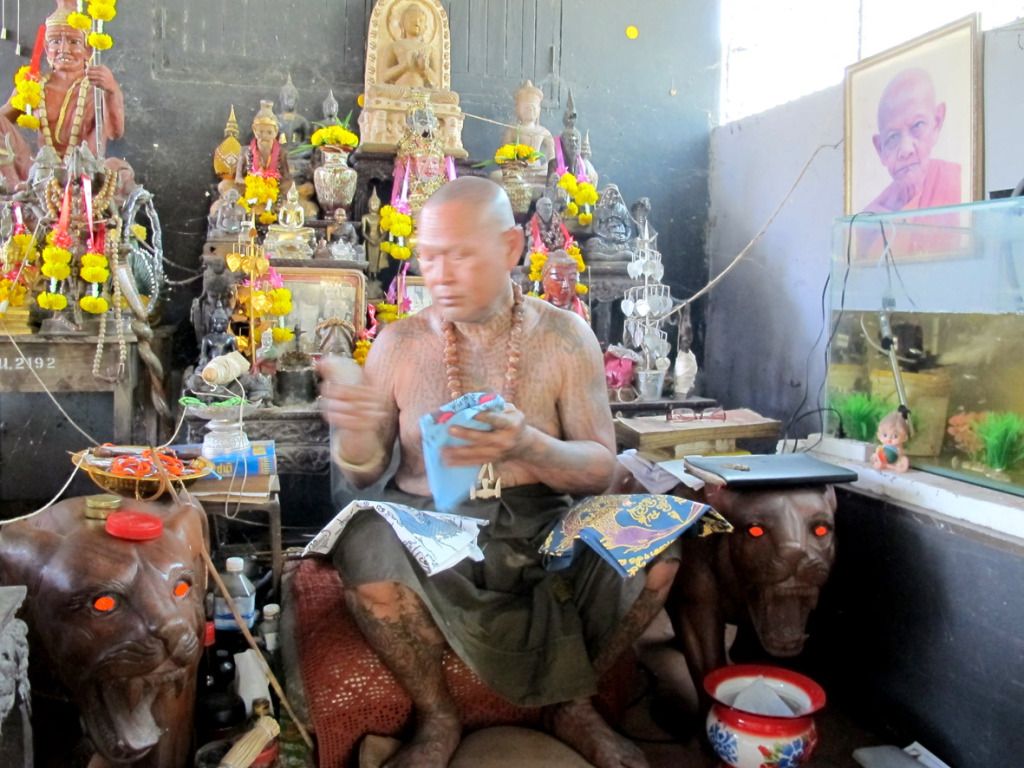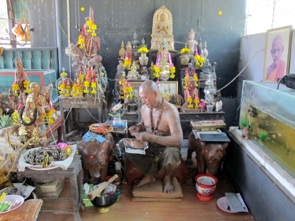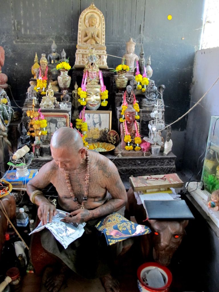 师父刚开光好的古曼~~这是特别版~~后面有一块童子骨^^,三支金tarkut ^^还有一些不知名的材料