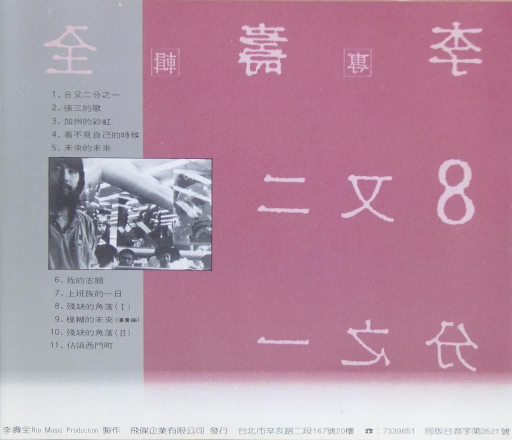 这是唱给流浪人群的一张专辑,在专辑文案上,有这样的话:“总是念着什么时候才停止流浪,事实上,人生就是流浪。被过去赶着逃,被未来牵着跑。”这是一名台湾八十年代音乐人的生命感言,但是二十年后,它依然没有过时。同时,这也是一张灰色至极的专辑,是一篇书写青春残酷逝去的音乐日记。当大多数流行音乐唱片都在进行歌颂式主旋律的唯美营造时,李寿全选择了单枪匹马式的揭露与验伤。专辑的名字《8又二分之一》大约源于意大利费里尼的同名电影《8又二分之一》吧,也许李寿全是想借用这部令人目眩神迷却又难以言喻的电影来表达一种迷惘和困惑。整张专辑内敛大气,旋律上简约流畅,词作朴实真切,感性的知觉和理性的思忖兼具。李寿全成熟低沉的男性嗓音将这张专辑演绎的算不上完美却极富生命力。