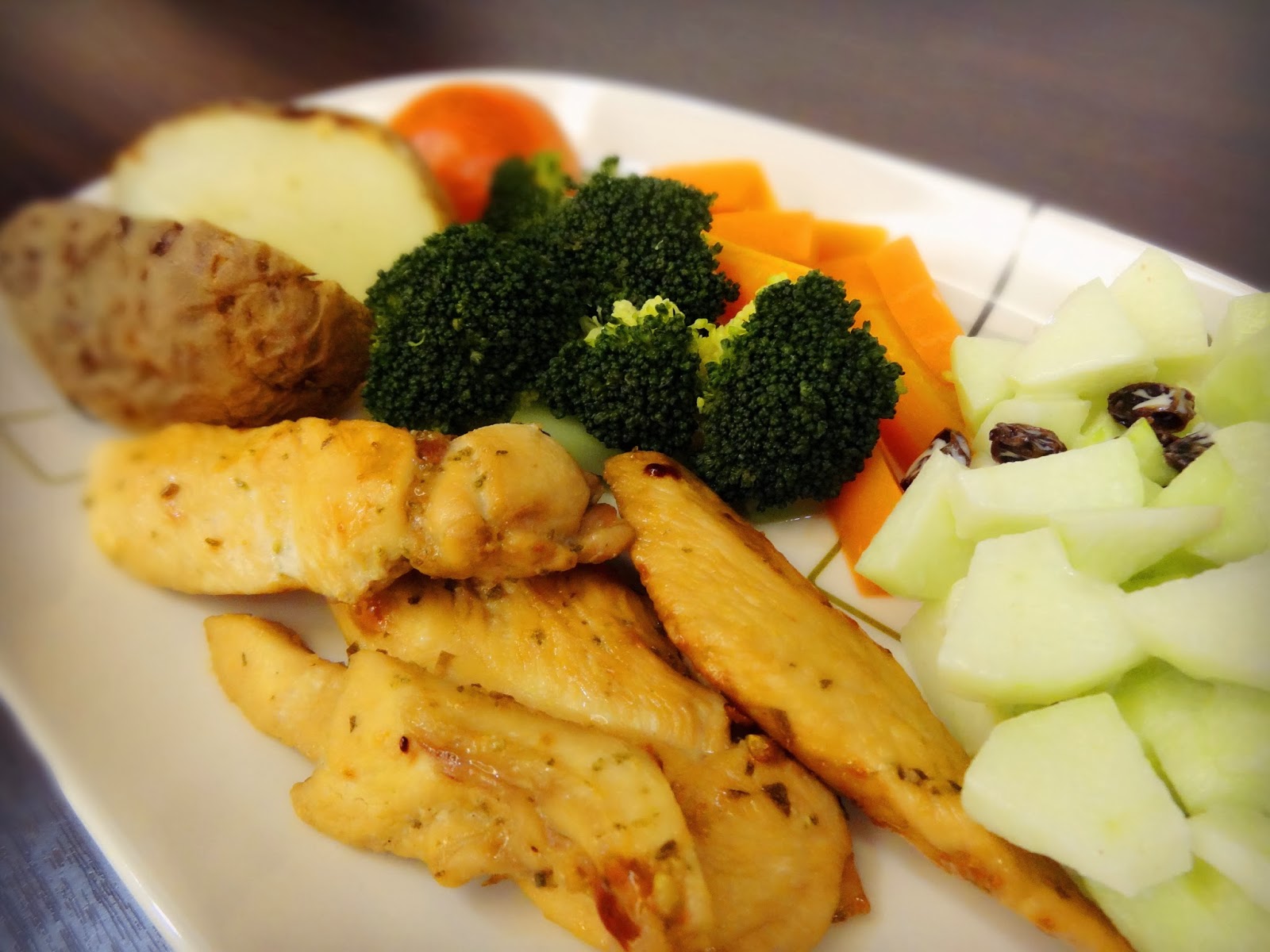 简单的白灼菜就不多说了,就送上青柠蜜汁鸡脯、烤马铃薯、煎番茄和青苹果沙拉吧~