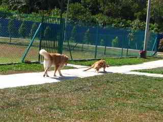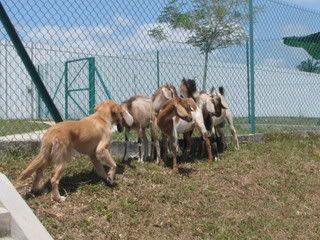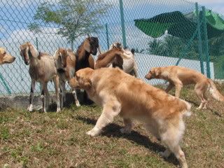 游泳回来了!! 今天我家的怪兽和titan,coco上演了一场“黄金赶羊记” ,他们把几只羊击退在一个角落。 迟点等titan妈上照片!