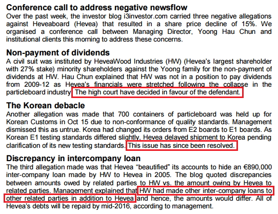 As an outsider, I am not privy to what is the real crux of the disputes such that the shareholders of Heveawood Industries must bring this matter up to the court of laws to sort it out. I am dismayed, sad and disappointed that Hevea as a listed entity had chosen to conceal and hide these law suits away from the knowledge of all of us, both as an individual shareholder and as a general investing public.