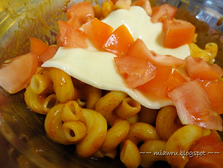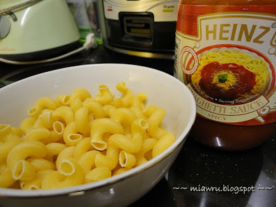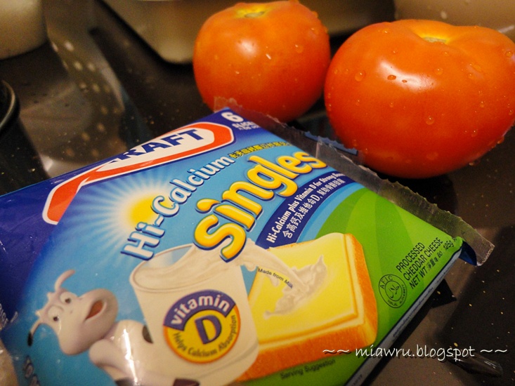 | | 由于是要给婷婷吃的,所以买比较适合小孩子吃的cheeze片。 | 首先,现将空心粉用清水汤熟,盛起,然后加入意大利面酱,捞均匀,铺上一片起士片及一些番茄丁。最后就放进锅里隔水蒸十五分钟。