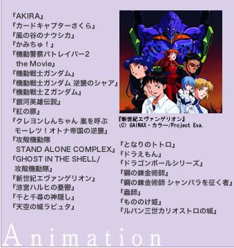 动画领域的第一名为《新世纪福音战士》,得票3500张,其次分别为《风之谷》和《天空之城》。宫崎骏共有7部作品入选。漫画领域的第一名为井上雄彦的《灌篮高手》,其次为《JOJO的奇妙冒险》。(入选名单如下)