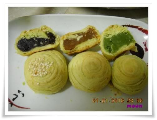 又来做自家最受喜爱的酥饼,这次做了1份半的份量,三种口味(白豆沙,黑豆沙及班兰味豆沙),共做了66粒~六六大顺 。。。
