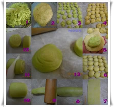 3。放平直再杆一次成长条状(图9),翻面放正让光滑面朝下,卷起后整形成短肥状(图10),对切成二半(图11),将有切口处压扁平(图12),杆压成一张圆皮(图13),将用刀切过的那面朝下(当外皮花纹才会美丽),再包入豆沙用手掌压成圆饼状(图14)