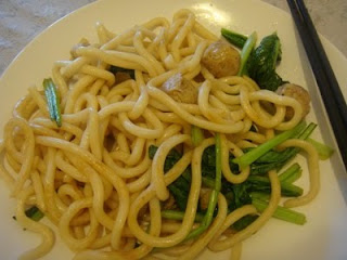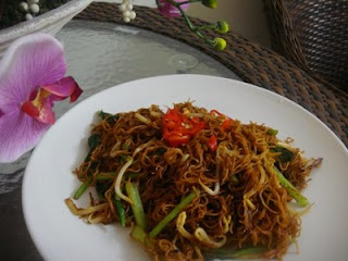 3.接着把面线加入,马上淋上少量的胡椒粉,适量黑酱油和生抽快炒即可。