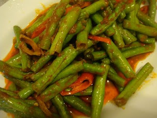 【三巴长豆】 1.烧开两汤匙油,(菜豆比较吃油)。 2.把菜豆和红辣椒倒入。 3.把菜豆炒至转深绿色,加入适量的盐和辣椒糊炒匀即可。