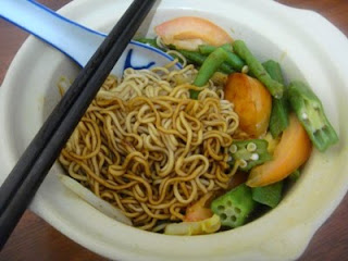 【Tom Yam 干捞面】 制作: 1.把快熟面和蔬菜烫了备用。 2.把即煮TOMYAM酱加少许的黑酱油拌匀,倒入面拌匀即可。