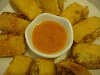 【干炸豆腐】 1.三大汤匙面粉和80-100ml清水混合(大概的分量)。 2.加入适量的胡椒粉,素G粉和盐搅匀。 3.加入芽菜和胡萝卜丝混成糊。 4.豆干切对半,把芽菜糊酿入豆干内。 5.用大火炸即可。
