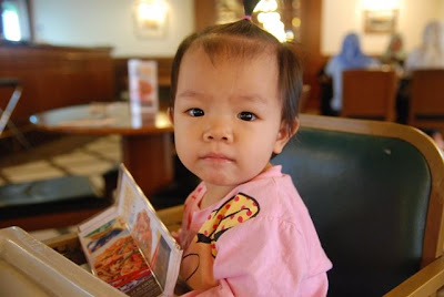 好象大部分的小孩子都一样,坐不住,给她东西也是玩一下就拿来丢