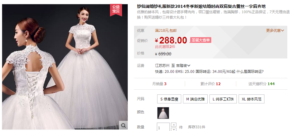 这婚纱的原价699,圣诞特惠288,店铺还有给10元优惠,而且又免邮,所以实价是278, 还有送头纱、手套及裙撑。