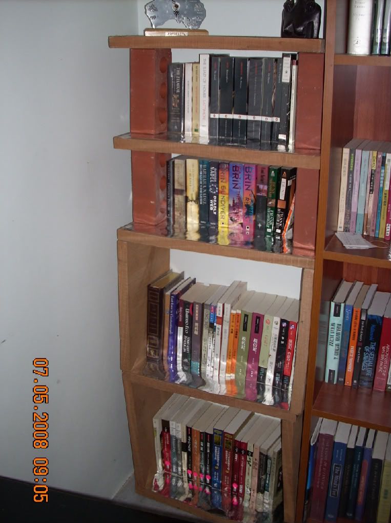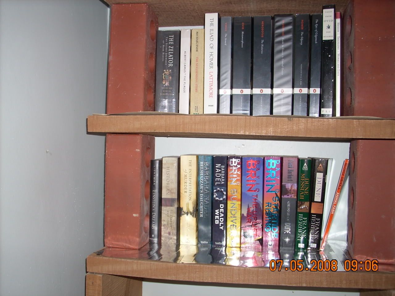 昨晚钉的书架,很烂的手工,其实只是个四方架,置起来,上面两片板还是用砖支承,因为拿错太坚硬的木料,连铁钉都难以钉住,没法只好这样,迟些有比较软的木料才做过。anyway,全部才花不超过10rm。
