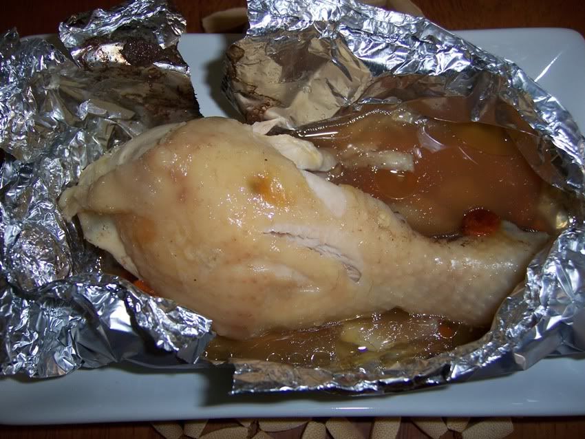 鸡腿平均的洒盐,在锡纸里加水、当归和枸子,包好不让水流出,因为 ...