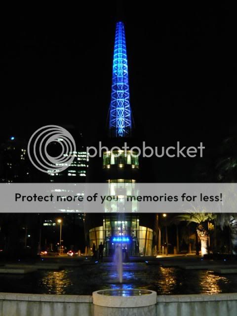 钟楼的灯,从蓝色变成了紫色。从这个角度看来,这钟楼有点像天鹅哦,那两片铜片就像是天鹅的翅膀,而钟楼就像是天鹅的颈项。