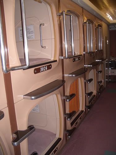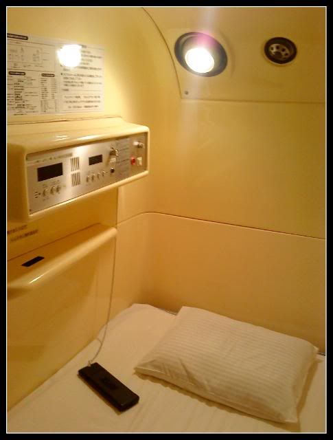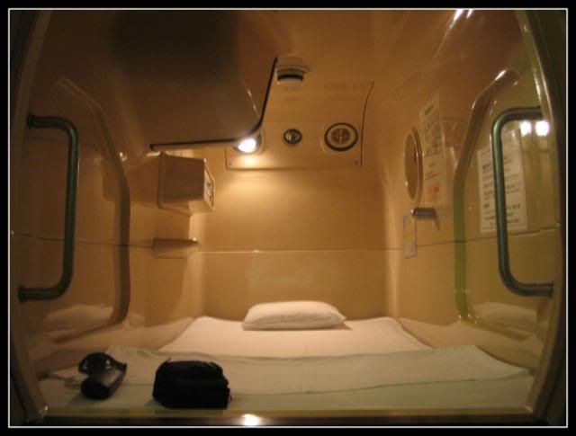 它是胶囊酒店(Capsule Hotel)! 这就是我的“房间”,空间只有2m x 1m x 1m这么大而已!如果你有看过The 5th Element这部戏的话,应该会对戏中女主角所睡的地方有印象吧?就是这种胶囊床位!里面有小型电视机,闹钟和收音机,“门口”有竹帘可以拉下,睡觉时就不怕被别人看见咯!(忘了告诉大家这间酒店只限男生投宿哦! )