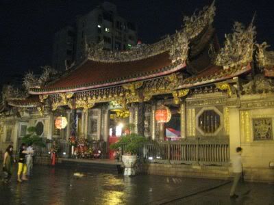 雨越下越大了, 赶紧回到捷运站外避雨, 然后就站在路边享用我的烤鸡排. 鸡扒吃完了, 雨还是很大, 算了, 打算到龙山寺旁的华西街夜市找点东西来吃, 心想那边应该没下雨吧. 又上了捷运到龙山寺, 还好, 只是毛毛雨而已.
