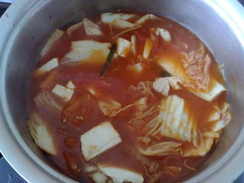 我老公是用泡菜,加水,放猪肉(会比较有味),豆腐,和年糕,辣椒粉,和蚝油。就变成了泡菜汤。