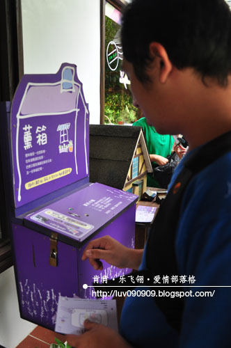 在精品店的外面有一个紫色箱子,只要把票子上的其中一块撕下来放进箱子里,再抽出来的时候就会有薰衣草的味道了哦!老公还在研究着箱子上的指示,但是搞不清楚的他却不小心把纸条掉进箱子里了,剩下我的那片就香香~可是不耐久,呵呵~