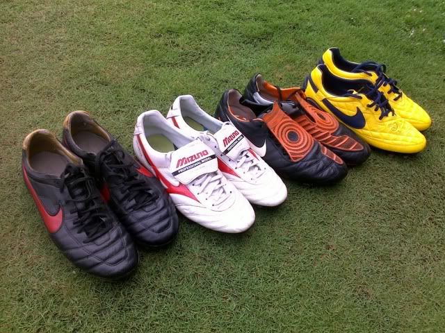 我的球鞋,全是FG的,都是袋鼠皮的,最高等级,左至右,nike tiempo legend 2 ,mizuno morelia,nike total 90 laser 2 K leather,还有新买的nike tiempo ronaldiho dois,都是UK9.5...mizuno和黄色 dois能低价割爱,有兴趣者短消息我~ |