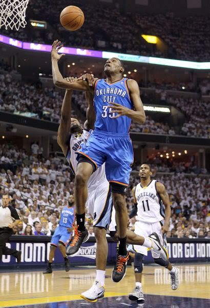 下半场开始后杜兰特就率先扣篮拿到2分,但此后接近4分钟的时间里雷霆都没有得分,小加索尔连进两球将差距缩小到个位数。雷霆在韦斯特布鲁克的带领下打出7-2的进攻取得14分的领先,接下来灰熊的进攻也还是集中在小加索尔身上,他连续进球得分为球队维持比分差距。但是杜兰特和帕金斯分别进球后,科里森也连投带罚得分,雷霆打出8-0的进攻取得21分的领先。接下来灰熊的亚瑟和兰多夫都有进球,然而杜兰特又是三分命中,最后33秒时科里森二次进攻得分,雷霆以71-52领先灰熊。杜兰特单节拿到8分。