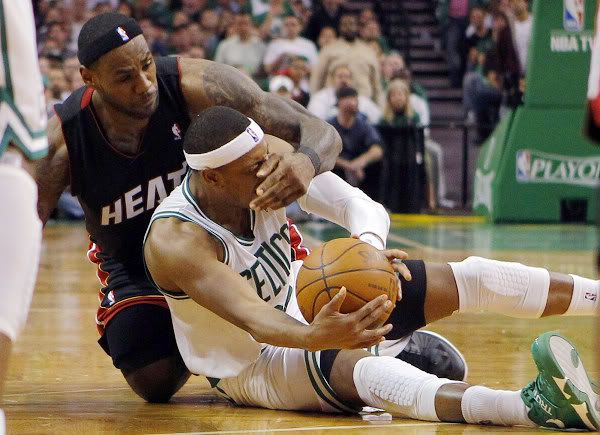 热火队三人得分上双,韦德贡献本赛季季后赛个人得分新高38分,此外还有5次助攻3次抢断2次封盖,詹姆斯22分5次助攻6个篮板,替补球员琼斯成为奇兵,砍下个人季后赛新高的25分。凯尔特人队三人上双,雷阿伦贡献25分3次助攻,皮尔斯19分7个篮板,末节两次技术犯规被逐出场,韦斯特10分5个篮板。