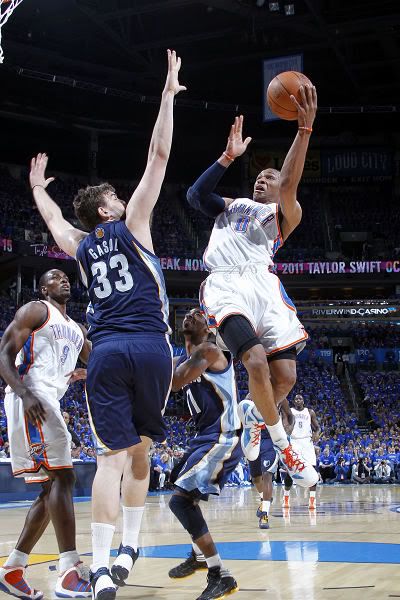 雷霆进攻主要靠威斯布鲁克,他上半场就砍下了15分,不过第三节他的命中率开始下降,雷霆以遭到灰熊的反扑。