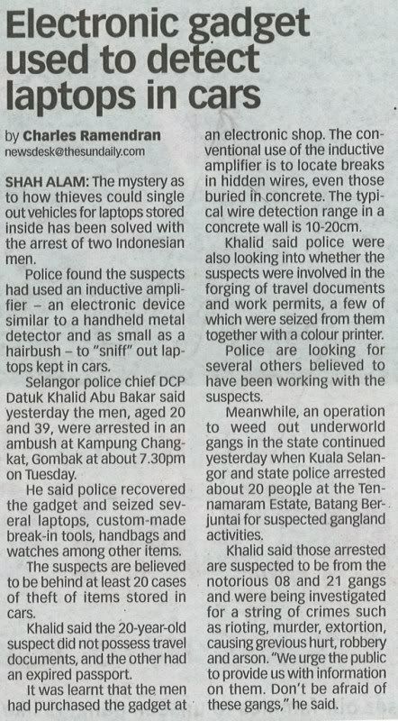 不一定是laptop, 我朋友在sri petaling中的是portable harddisk 和 PSP,當然還有左邊車鏡一塊。 |