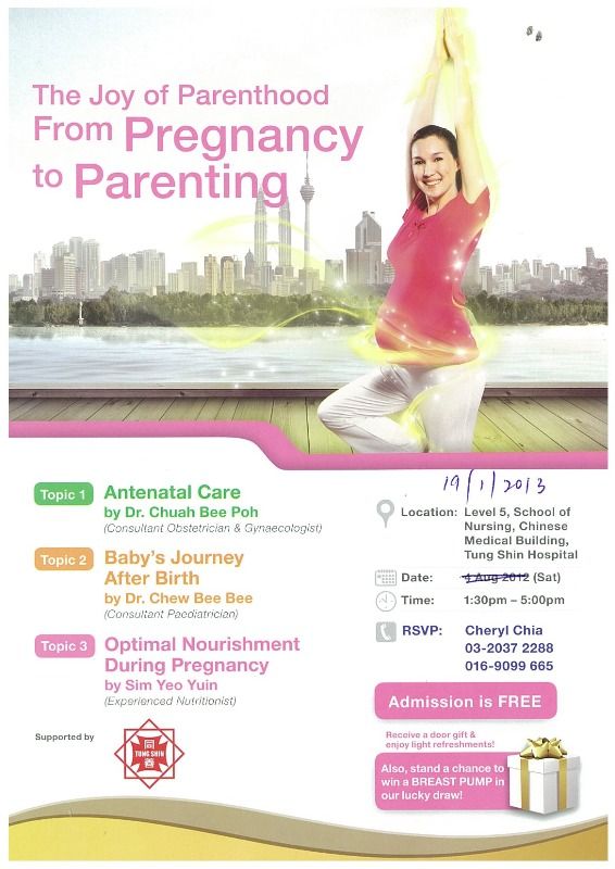 Pre-Natal Class By Dr Tan Ee Ping 日期: 2013年6月22日(六) 时间: 13.00pm - 17.30pm 地点: Vivatel, Viva Home Hotel, Cheras 名额有限,从速报名。请致电 Yoke Mei @ 016-2622056 或 Racheal @ 012-3229820