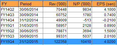 TEKSENG吸引我的地方,在于其2011年就已经涉足的太阳能业务。一直以来这一项业务都面对亏损,但来到这一季却已经带来了盈利,而且从前期的290万令吉亏损,一举推高到目前的1314万令吉盈利。