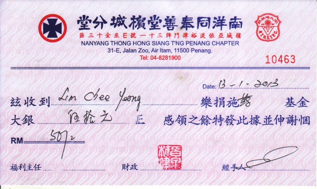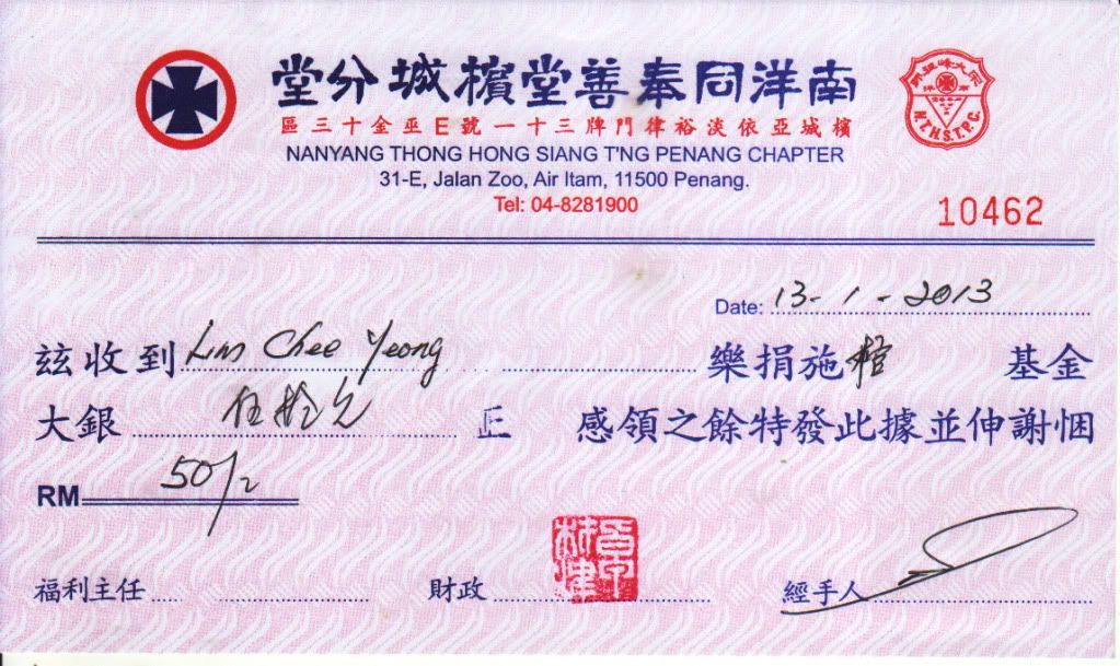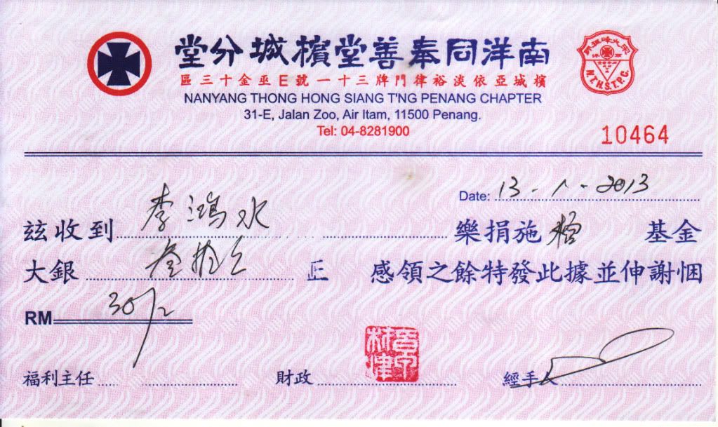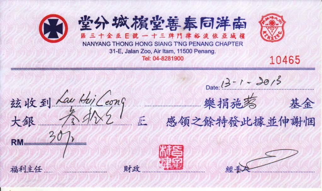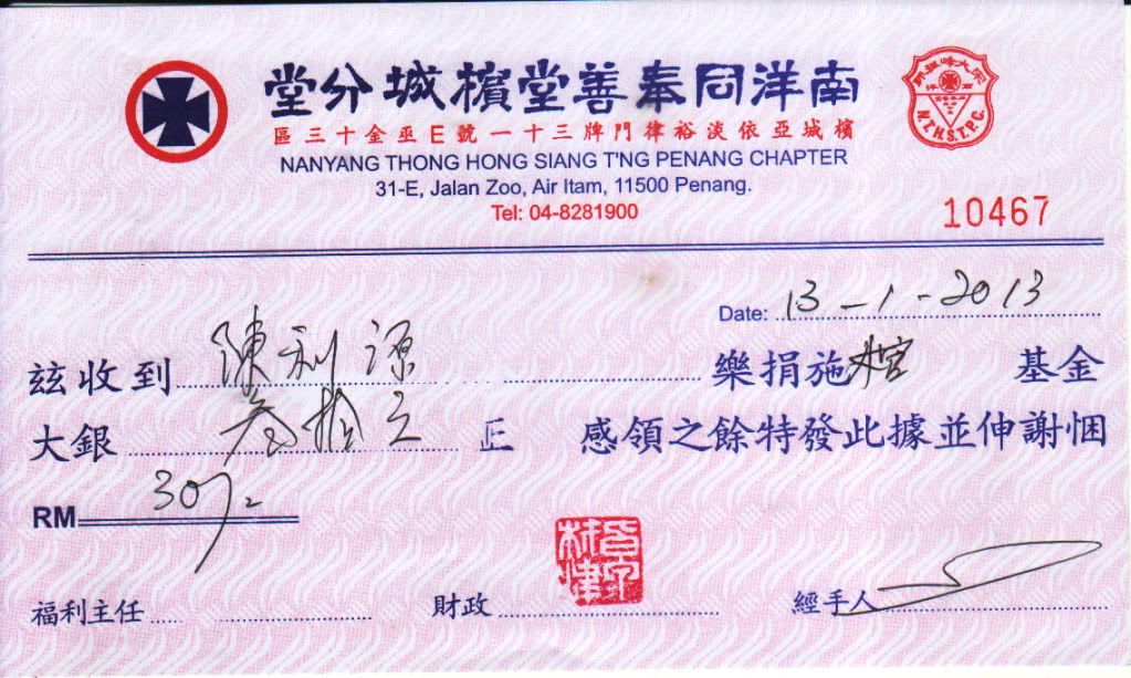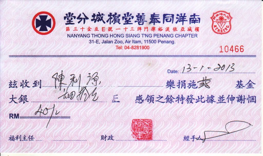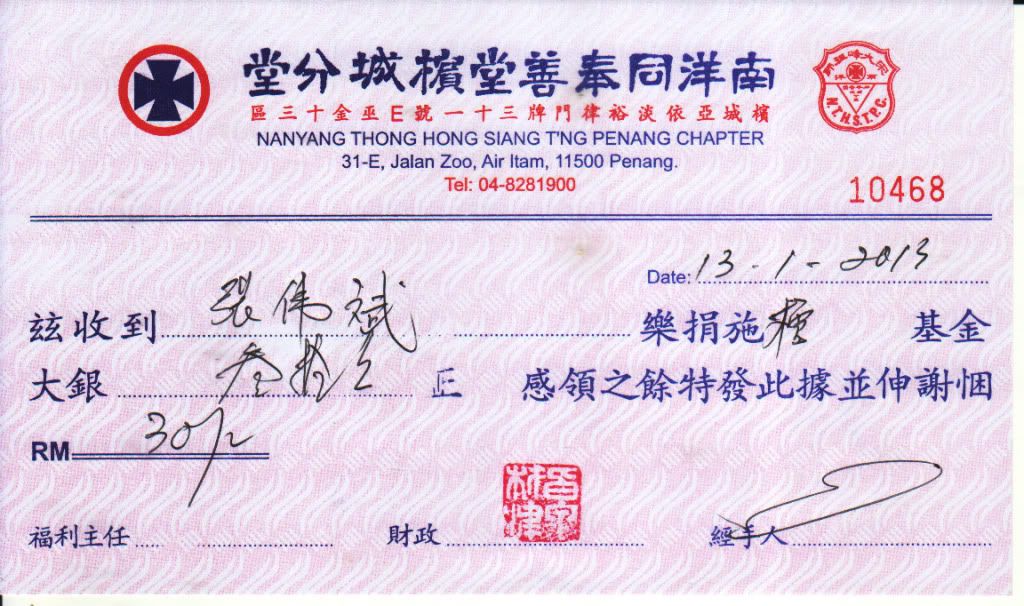 gaolin 发表于 13-1-2013 01:01 PM LZ,我帮朋友捐了三份,但是只看到两张收据,为什么呢?