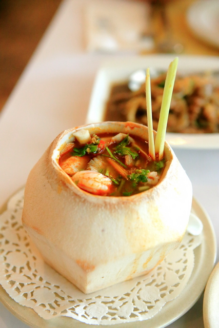 TOM YAM SEAFOOD SERVED IN YOUNG COCONUT