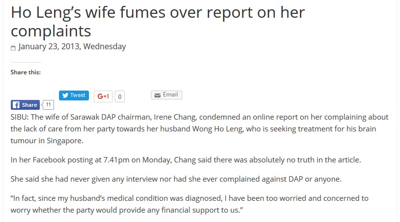 She further said, “During the Sibu by-election and the Sarawak State election last year, we used up almost all of our personal savings of RM700,000 for campaign expenses as there was very little support from DAP HQ. Then we begged the Foo Chow clansmen and businessmen for donations and financial aid and we managed to raise over RM10 million from friends, relatives and well-wishers…I think we probably spent about RM4 million from that amount but the rest seemed to have been transferred from DAP Sarawak and disappeared into the party coffers in DAP HQ and we have no access to the funds…And now Wong is sick and we need money for his medical treatment and all that Guan Eng can say or do is that the party will support us morally and help service the constituency…Where is the humanitarian support to us in this time of difficulty? Not a single sen coming out from the party after all that we have done and achieved for the party. Shame on you Guan Eng.”