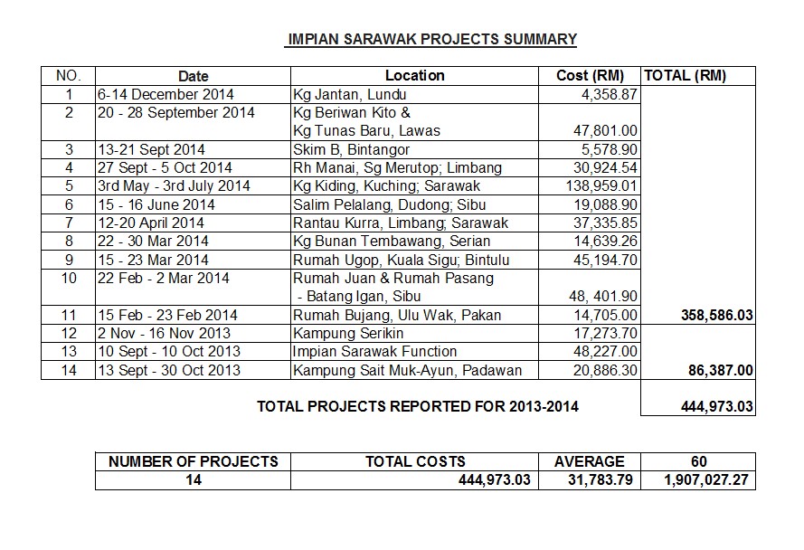 Jadi, anggaran kos untuk 60 projek Impian Sarawak sehingga 2016 ialah sebanyak RM1,907,027.29 (RM1.9juta).