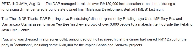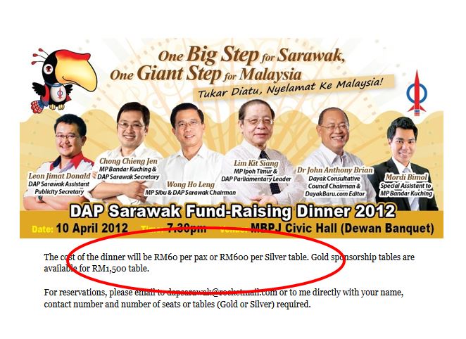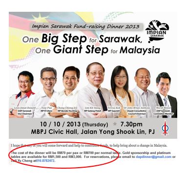 Tapi maklumat dalaman mengatakan DAP mengutip setinggi RM 3,000,000.00 (RM3juta) hasil dari sumbangan pembelian meja dan kutipan derma meja ke meja untuk majlis Fund Raising Dinner dari tahun 2011 sehingga sekarang. (jumlah termasuk kutipan derma untuk pilihanraya).