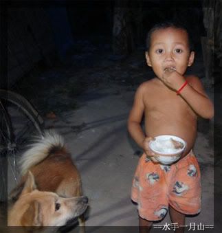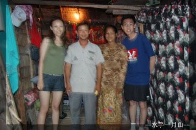 左边蓝色衣服是我. 后面站着的就是SAMBATH, 我旁边的是SAMBATH的好朋友TAT. TAT是个很热情很讥喳的人, 整个晚上就一直在说话, 说笑. TAT旁边的四个人, 两个洋人, 两个一男一女亚洲人, 是TAT的客人, 也被邀请来一起晚餐. 那个华裔男生告诉我们说他小时候在马来西亚住了两年, 后来就到了加拿大, 女生也是来自加拿大. 由于不熟, 我们和那群客人比较少交流, 反而是SAMABTH就一直和我们聊天. 他让我们看从前的照片, 原来我们不是第一批去拜访他的游客哦, 之前有一对荷兰夫妇就曾经去过, 他还留着当时的照片. 也和我们谈到了他自己. 原来他从前拥有一辆TT, 可是4年前因为太太病了住院, 他只好卖了来还医药费. 现在的TT是和人租来的, 每个月三十美金. 他也希望自己能够存到钱买一辆自己的TT, 或是CAMRY来载客, 一辆CAMRY要大概6000美金. 他现在有儿子女儿各一个儿子儿子三岁了, 叫DAVID, 女儿8个月大. 还有一个十一岁大的继子.