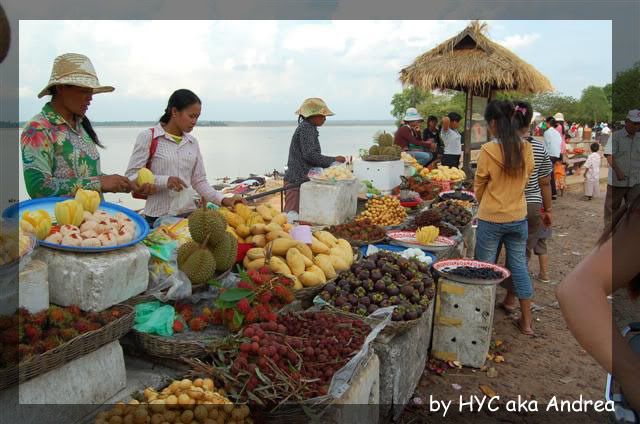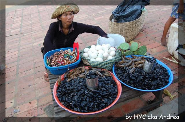 堤坝旁是很热闹的市集, 就像我们的PASAR MALAM那样, 旁边还有一些建好的寮子让人摆摊, 类似巴杀. 吧交通工具停在那里需要付费. 照片里头盘中黑黑的, SAMBATH说是一种水生的虫, 很可口, 他甚至要买一些来请我们吃......