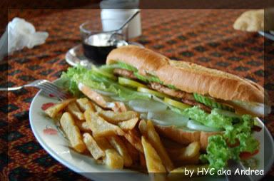 MOLLOPOR的环境满不错的, 傍晚的时候去, 店家把气氛营造的很浪漫的说. 我们到二楼去坐. MOLLOPOR是那种榻榻米式的位子, 没有椅子的, 后边还有个厢房式的, 如果人多的话可以用. 那里应该是当地情侣(或者在追求中的男女)吃饭的其中一个佳选, 因为我们到之后, 就有好几对男女陆续到达, 生意很不错. 在楼上还有个泡澡的浴池, 傍晚5点到8点让女生泡, 8点到10点是让男生泡, 应该算是比较另类的”男女共浴”吧. 服务生的态度还不错, 但是速度有点慢. 他们会给客人一杯开水, 客人可以自由续杯. 我们俩都点了冰沙, HY点炒面, 我要了份日式的榨菜汤面. 因为真的很累, 累到没有胃口, 想吃点味道比较重的来开胃. 准备食物的速度倒是满快的, 不一会就上菜了. 我的榨菜汤面味道真好, 榨菜的味道渗到汤里头, 让汤变得很美味, 很开胃! 太累了, 所以没有照相. MOLLOPOR就在SR河旁, 沿着SR河慢慢走就看得到了, 但是它是在河的另一边. 结账时, 很便宜, 才USD4.75, 还比我们那难吃的早餐便宜......