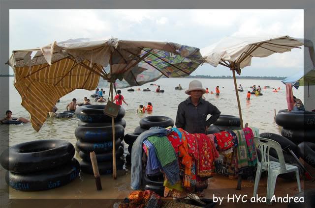 下了堤坝, 就见到酱的摊子. 她在出租充气内胎, 让人玩水用的, 还有出租很多的衣服, 让人下水用, 酱紫没有带换洗衣服的人也可以下水玩了. 我是在那里第一次看到有人穿全套的睡衣玩水的...... 还有, 他们的沙龙真的是万用的, 包一包, 就可以下水玩了, 玩过后, 要换衣服, 虽然有一些更衣的隔间, 但是多数人都是直接沙龙抹干净了, 内衣内裤直接套上(还包着沙龙), 再穿上衣服, 之后才脱掉沙龙... 厉害吧......