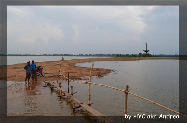 搭船到西梅本. 在平时, 水位是比现在来得高得多, 船可以直接到达西梅本寺旁边(箭头指处), 但是现在干旱季节, 水位低, 只可以到达这个地方, 那里有人会在等游客上岸, 可以用电单车载到寺旁, 当然要付钱. 我们选择走路.