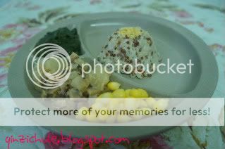 玉米排骨汤 + 味增焖香菇白萝卜 + 冷压橄榄油拌蒜头番薯叶 + 糙米 + 能量三宝(大豆卵磷脂、小麦胚芽、酵母薄片)