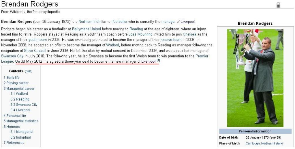 Brendan Rodgers 和 Liverpool 的 Wikipedia 都改了。
