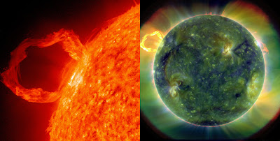 [注:An erupting prominence (left) and a full-disk multiwavelength extreme ultraviolet image of the sun (right) taken by SDO on March 30, 2010 (NASA)]