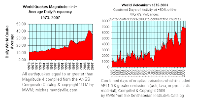 1973年~2007年 ,4级以上地震不断上升;1875年~2004年 ,火山活动不断上升;1880年~2000年 ,海平面不断上升;1880年~2000年 ,全球气温不断上升;1916年 ~1996年 ,美国飓风数量不断上升。